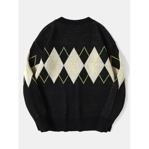 Men Knitted Lattice Long Sleeve Casual Round Neck Loose Sweaters