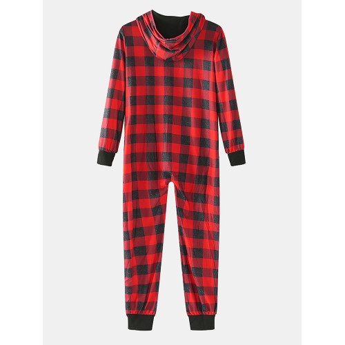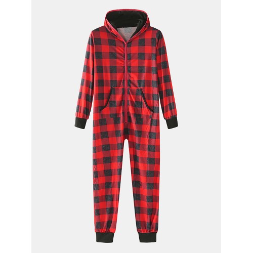 Mens Classical Plaid Print Front Pocket Long Sleeve Zipper Hooded Jumpsuit Home One Piece Pajamas