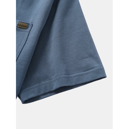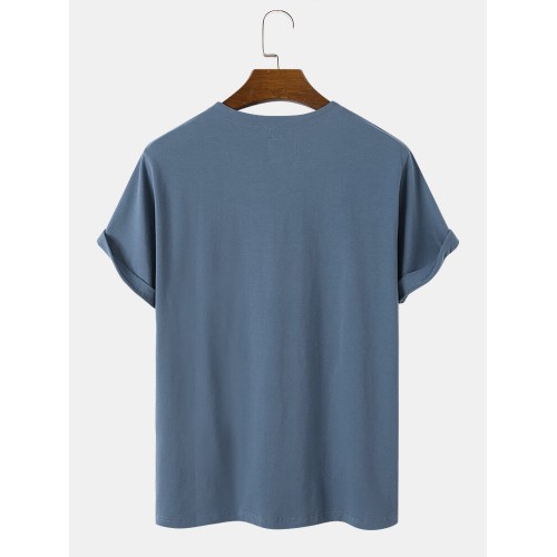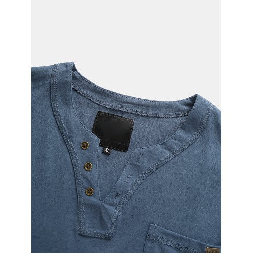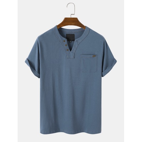 Men Cotton Henley Collar Solid Chest Pocket Short Sleeve Regular Fit Soft T Shirts